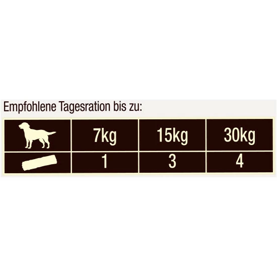- Fütterungshinweise: Empfohlene Tagesration bis zu: 7kg: 1 Stück pro Tag; 15kg: 2 Stück pro Tag; 30kg: 4 Stück pro TagBitte reduzieren Sie die Hauptmahlzeit entsprechend.