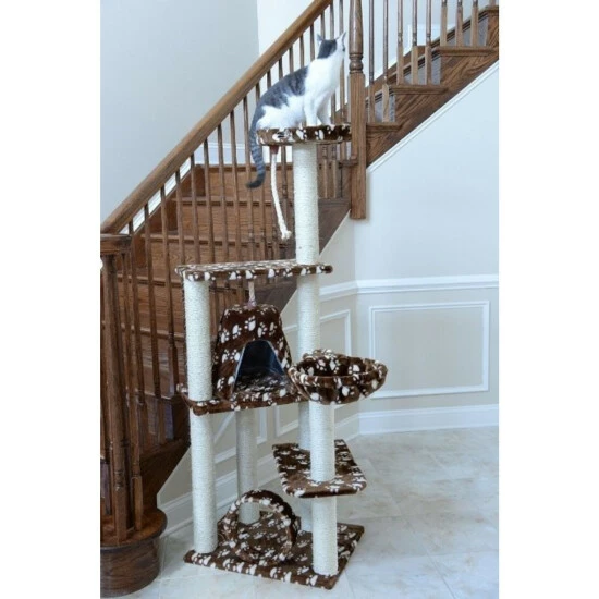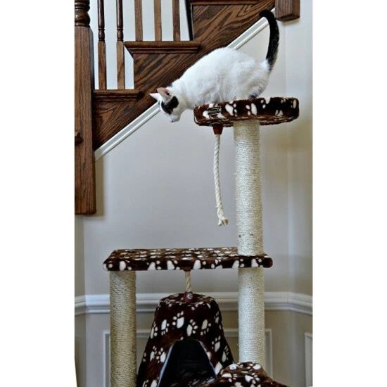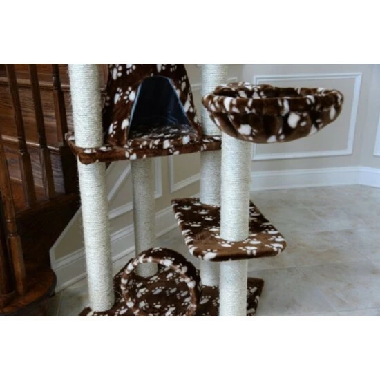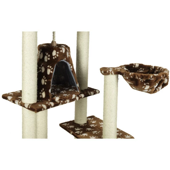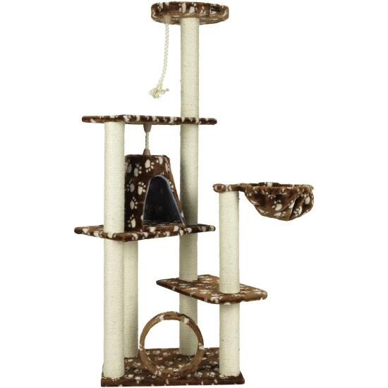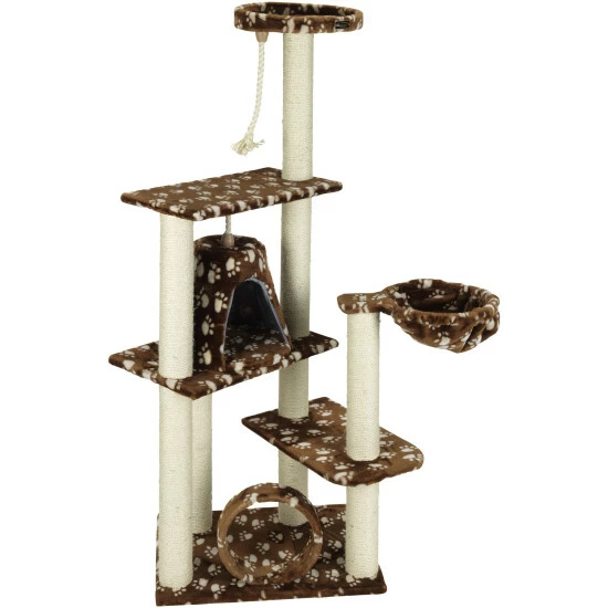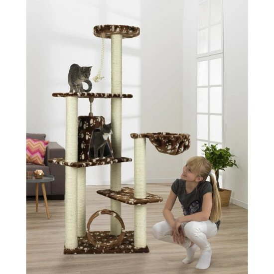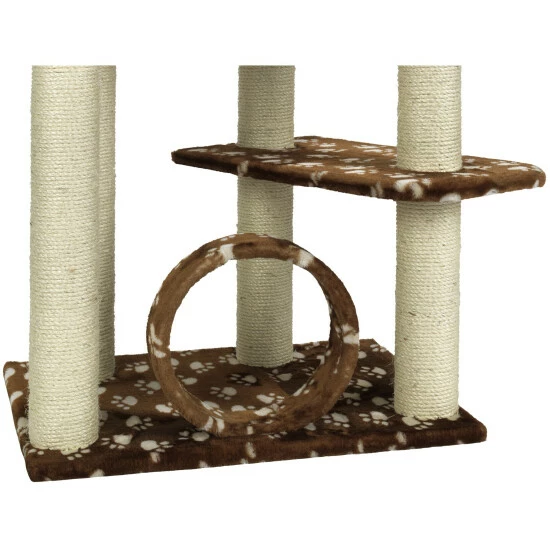 - Lieferumfang: Bodenplatte; Spielröhre (ØxH: 30×10 cm); Platte (BxT: 30×50 cm); Platte unter Katzenhaus (BxT: 55×35 cm); Kegelförmiges Katzenhaus (Ø unten/Ø oben/H: 35/20/35 cm) mit Ein-/Ausgang (BxH: 20×22 cm); Große Liegeplatte (BxT: 55×30 cm); Liegemulde (ØxT: 30×15 cm); Runde Liegefläche oben (Ø: 35 cm) mit 6 cm Rand; Spielseil aus Natursisal (L: 38 cm); 9 Sisalstämme (2 Stk. á 60 cm, 3 Stk. á 48 cm, 1 Stk. á 45 cm, 2 Stk. á 34 cm, 1 Stk. á 25 cm)