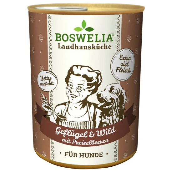 - Zusammensetzung: 47% Geflügelfleisch, -leber, -herz, magen, 24% Fleischbrühe, 23% Wildfleisch, 2% Kartoffeln, 1% Erbsen, 1% Wildpreiselbeeren, 0,5% Eierschalenpulver, 0,9% Mineralstoffe, 0,2% Distelöl, 0,2% Kräutermischung, 0,1% Inulin aus Zichorien, 0,1% Seealgen