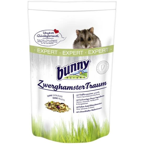 - Fütterungshinweise: Den Napf mit ZwerghamsterTraum EXPERT füllen und leer fressen lassen, erst dann wieder auffüllen. Bitte auch die Hamster-Vorratskammer regelmäßig kontrollieren und ggf. die Futterreste entfernen. Täglich hochwertiges bunny Heu (z.B. bunny Heu mit Mehlwürmern) und frisches, handwarmes Wasser geben. In den ersten 4 Lebensmonaten können Sie Ihren Zwerghamster optimal in der Wachstumsphase unterstützen, indem Sie ZwerghamsterTraum EXPERT durch JuniorsExtra ergänzen