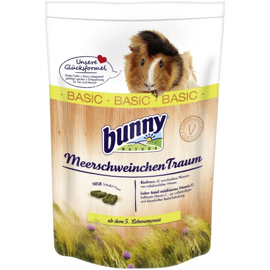- Fütterungshinweise: Den Napf mit MeerschweinchenTraum BASIC füllen und leer fressen lassen, erst dann wieder auffüllen. Täglich hochwertiges bunny Heu und frisches, handwarmes Wasser geben. Umstellen ab dem 5. Lebensjahr auf MeerschweinchenTraum SENIOR.