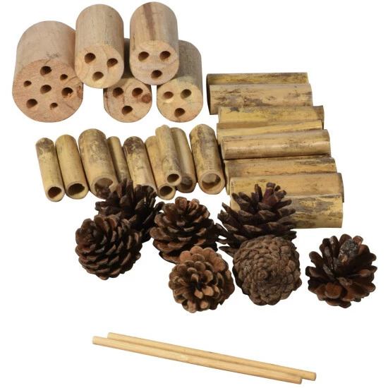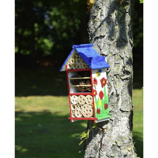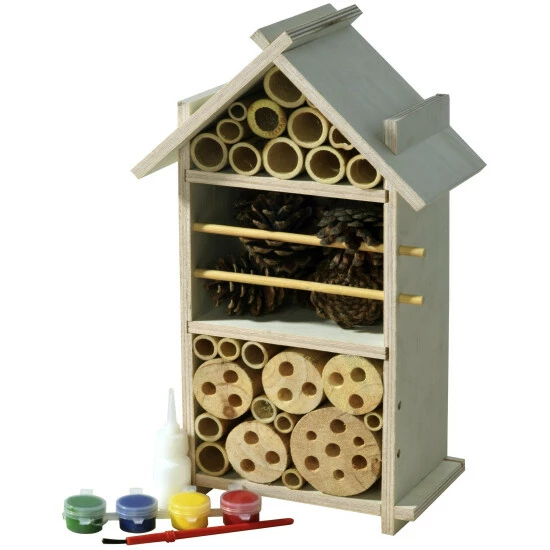 - Lieferumfang: 1x Insektenhotel, Füllmaterial, 1x Pinsel, 4 verschiedene Farben, Holzleim, Aufbauanleitung