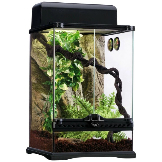 Lieferumfang: Exo Terra Glass Terrarium – Compact Top – Hygromometer – Thermometer – Rock Background – Water Dish Small – Plantation Soil – Jungle Plant Croton – Jungle Plant Amapallo – Jungle Vine Medium – Jungle Fern Small – Gebrauchsanleitung