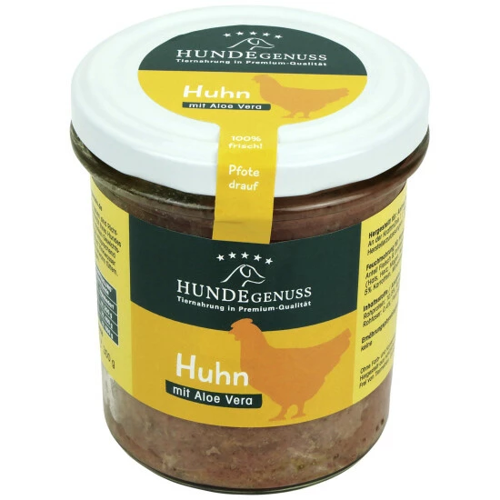 - Zusammensetzung: Muskelfleisch, Hals, Herz, Magen, Leber vom Huhn; Karotten; Kartoffeln; Aloe Vera; Mineralstoffe; Distelöl