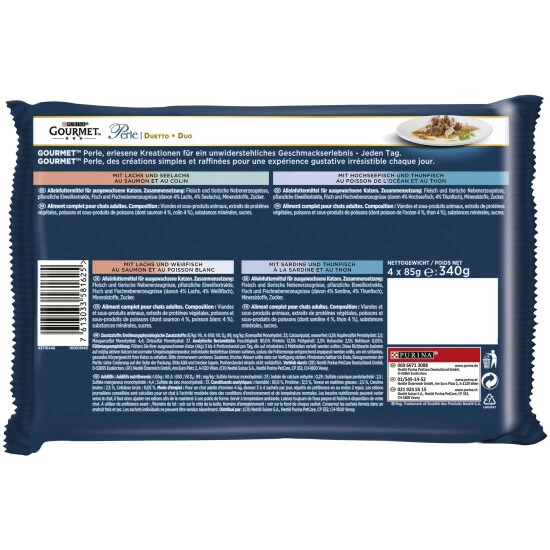 - Zusammensetzung: Zusammensetzung Mit Lachs & Seelachs:Fleisch und tierische Nebenerzeugnisse, pflanzliche Eiweißextrakte, Fisch und Fischnebenerzeugnisse (davon 4% Lachs, 4% Seelachs), Mineralstoffe, Zucker.Mit Hochseefisch & Thunfisch:Fleisch und tierische Nebenerzeugnisse, pflanzliche Eiweißextrakte, Fisch und Fischnebenerzeugnisse (4% Hochseefisch, 4% Thunfisch), Mineralstoffe, Zucker.Mit Lachs & Weißfisch:Fleisch und tierische Nebenerzeugnisse, pflanzliche Eiweißextrakte, Fisch und Fischnebenerzeugnisse (4% Lachs, 4% Weißfisch), Mineralstoffe, Zucker.Mit Sardine & Thunfisch:Fleisch und tierische Nebenerzeugnisse, pflanzliche Eiweißextrakte, Fisch und Fischnebenerzeugnisse (4% Sardine, 4% Thunfisch), Mineralstoffe, Zucker.