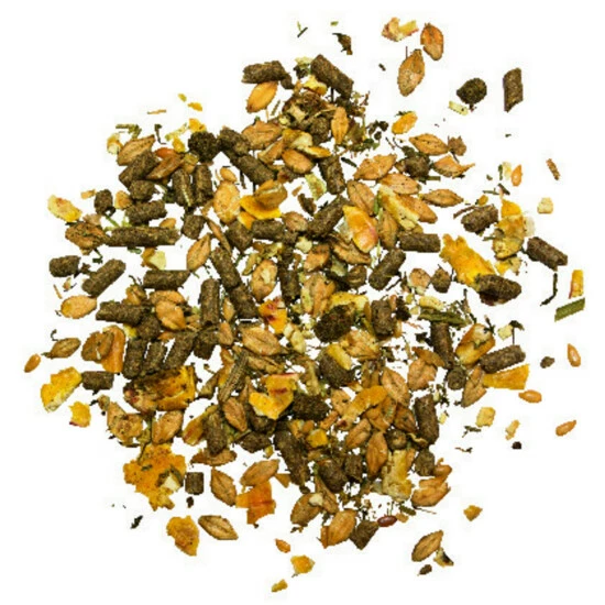 - Zusammensetzung: Gerstenflocken (23,00 %), Maisflocken(15,00 %), Weizengrießkleie (14,00 %),Apfeltrester, getrocknet (8,00 %), Haferkleie(7,00 %), Seealgenmehl (5,00 %), Leinsamen(4,00 %), Gras, hochtemperaturgetrocknet(4,00 %), Bierhefe (4,00 %), Kräuter (Brennnessel,Kamille, Melisse, Löwenzahnwurzel,Stiefmütterchenkraut, Spitzwegerich, Salbei,Walnussblätter) (4,00 %), Weizenfuttermehl(2,50 %), Pflanzenöl aus Raps, raff. (2,00 %),Rübenmelasse (2,00 %), Natriumchlorid (0,80 %)