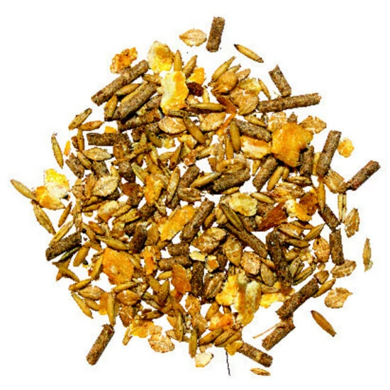 - Zusammensetzung: Gerstenflocken (20,00%), Maisflocken (15,00 %),Hafer (15,00 %), Weizengrießkleie (14,50 %),Rübenmelasseschnitzel, getrocknet (10,00 %),Haferkleie (7,00 %), Apfeltrester, getrocknet(4,00 %), Maiskleberfutter (3,50 %), Rübenmelasse(3,50 %), Weizenfuttermehl (3,00 %), Calciumcarbonat(1,60 %), Natriumchlorid (0,50 %),Monocalciumphosphat (0,50 %)