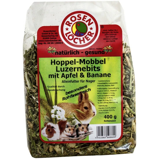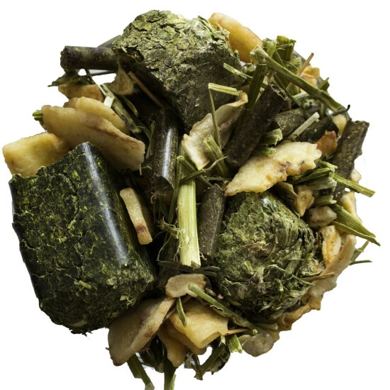 - Zusammensetzung: Grünmehlpellets mit Vitaminen, Luzernewürfel, Alfalfa Heu, Bananenchips, Apfelstücke