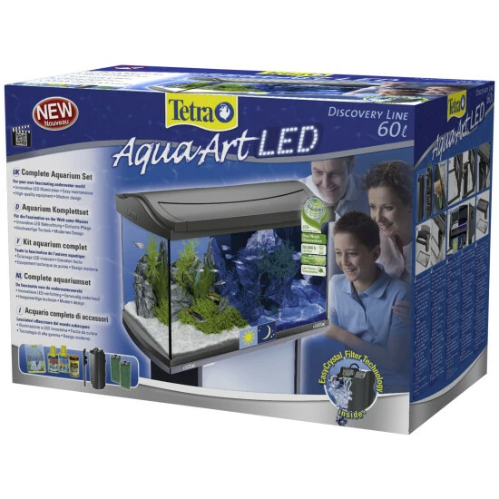 Lieferumfang: Aquarium mit Abdeckung, EasyCrystal Filter (3,5 Watt) mit zwei austauschbaren Filterkartuschen, LED-Beleuchtung (9,6 Watt), 50 Watt Heizer, Inkl. AquaSave, Easy Balance und TetraMin Flakes