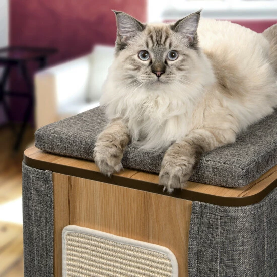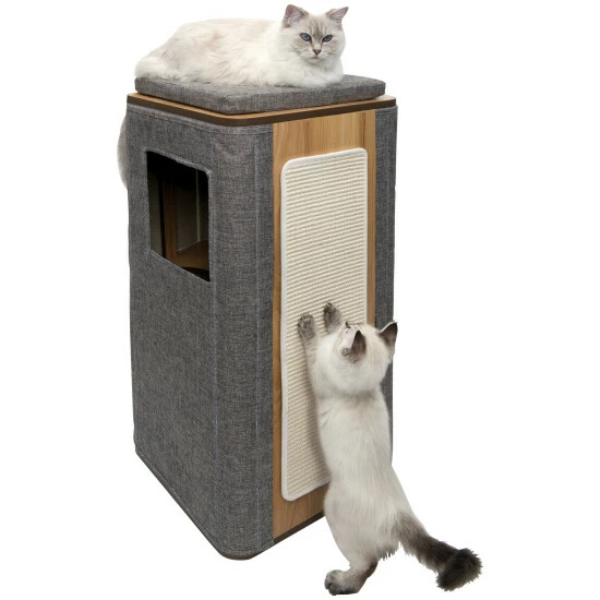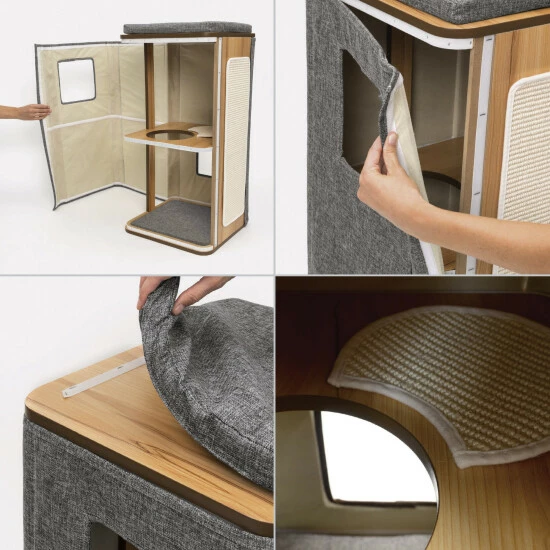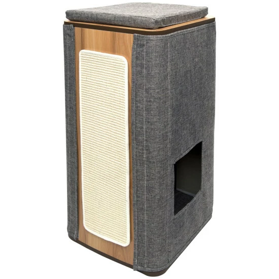 - Ausstattung: Lounge-Versteck, Memory-Schaumstoffkissen, abnehmbare Seitenabdeckung und Außenkissen, große abnehmbare Kratzfläche aus Sisal, hochwertiges MDF mit kratzfestem Walnussdekor