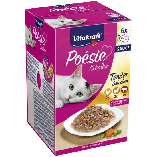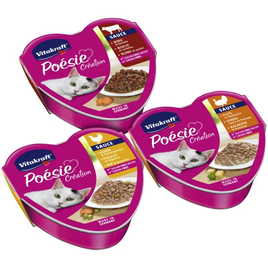 - Zusammensetzung: Huhn & Gartengemüse: Fleisch u. tierische Nebenerz. (55%, davon 5% Huhn);Gemüse (2% Karotten, 2% Erbsen);Pflanzliche Nebenerz.;Mineralstoffe;Milch und Molkereierz.;Inulin. + Pute in Käsesauce: Fleisch u. tierische Nebenerz. (55%, davon 5% Pute);Pflanzliche Nebenerz.;Mineralstoffe;Milch und Molkereierz. (2% Käse);Inulin. + Rind & Karotte: Fleisch u. tierische Nebenerz. (55%, davon 5% Rind);Gemüse (4% Karotten) Pflanzliche Nebenerz.;Mineralstoffe;Inulin.;